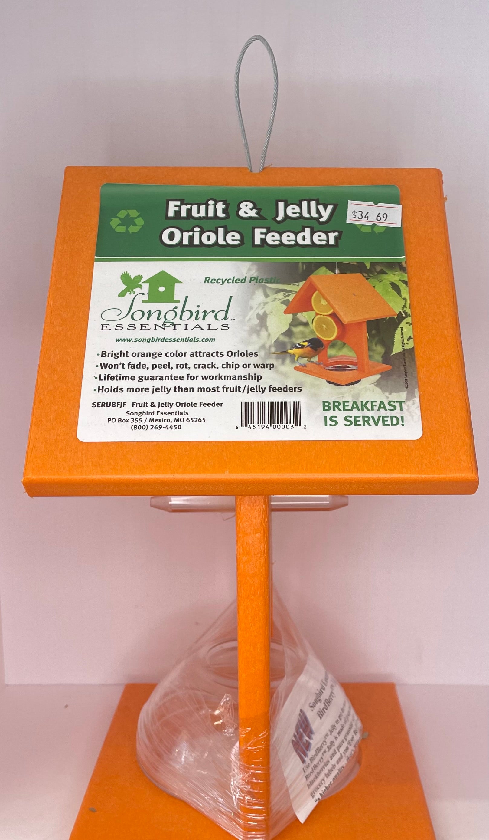 This bright orange oriole feeder is made from recycled plastics and won't fade, peel, rot, crack, chip or warp. It has a lifetime guarantee for workmanship. It has one large glass dish and 4 prongs for holding orange halves.