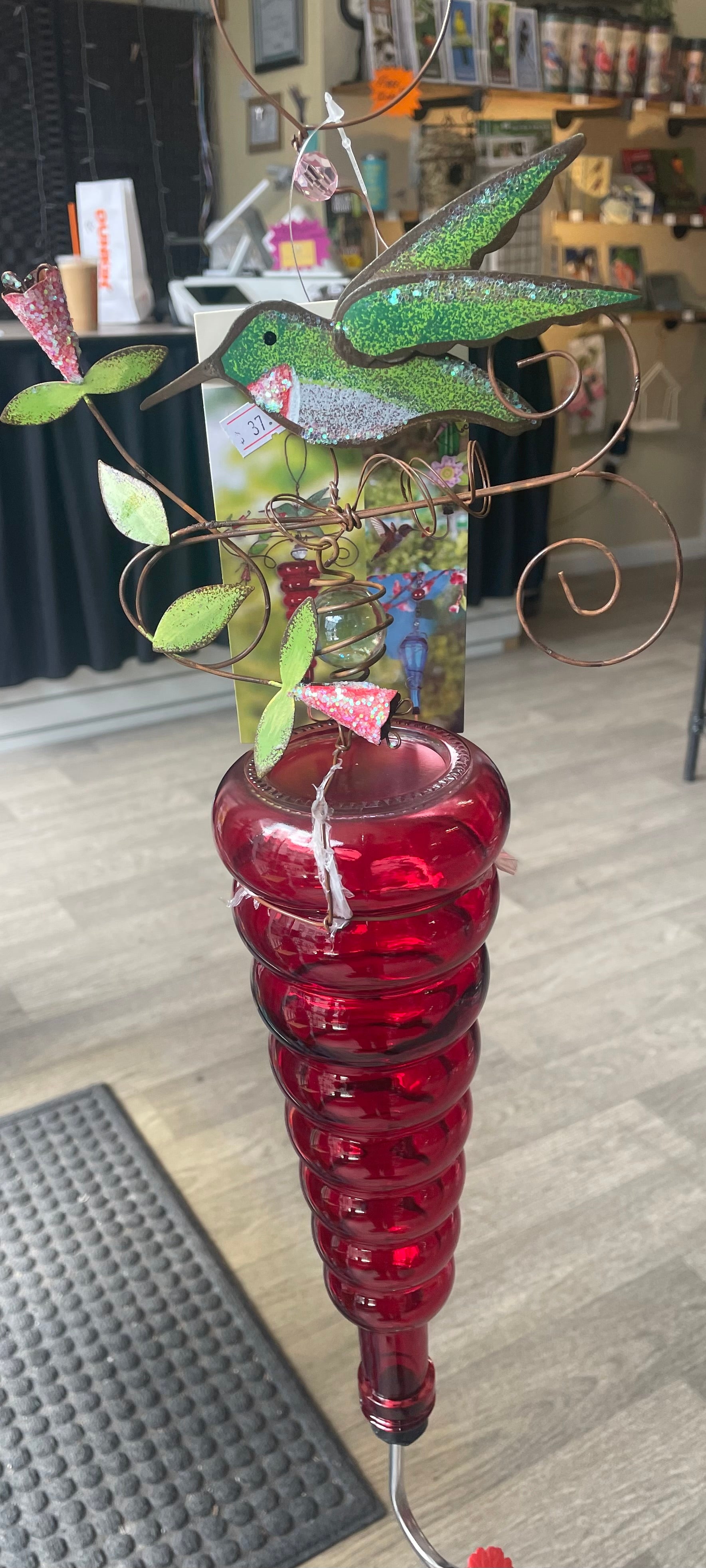 Beautiful Glass Hummingbird Feeder with metal hanger and decoratvie metal design!