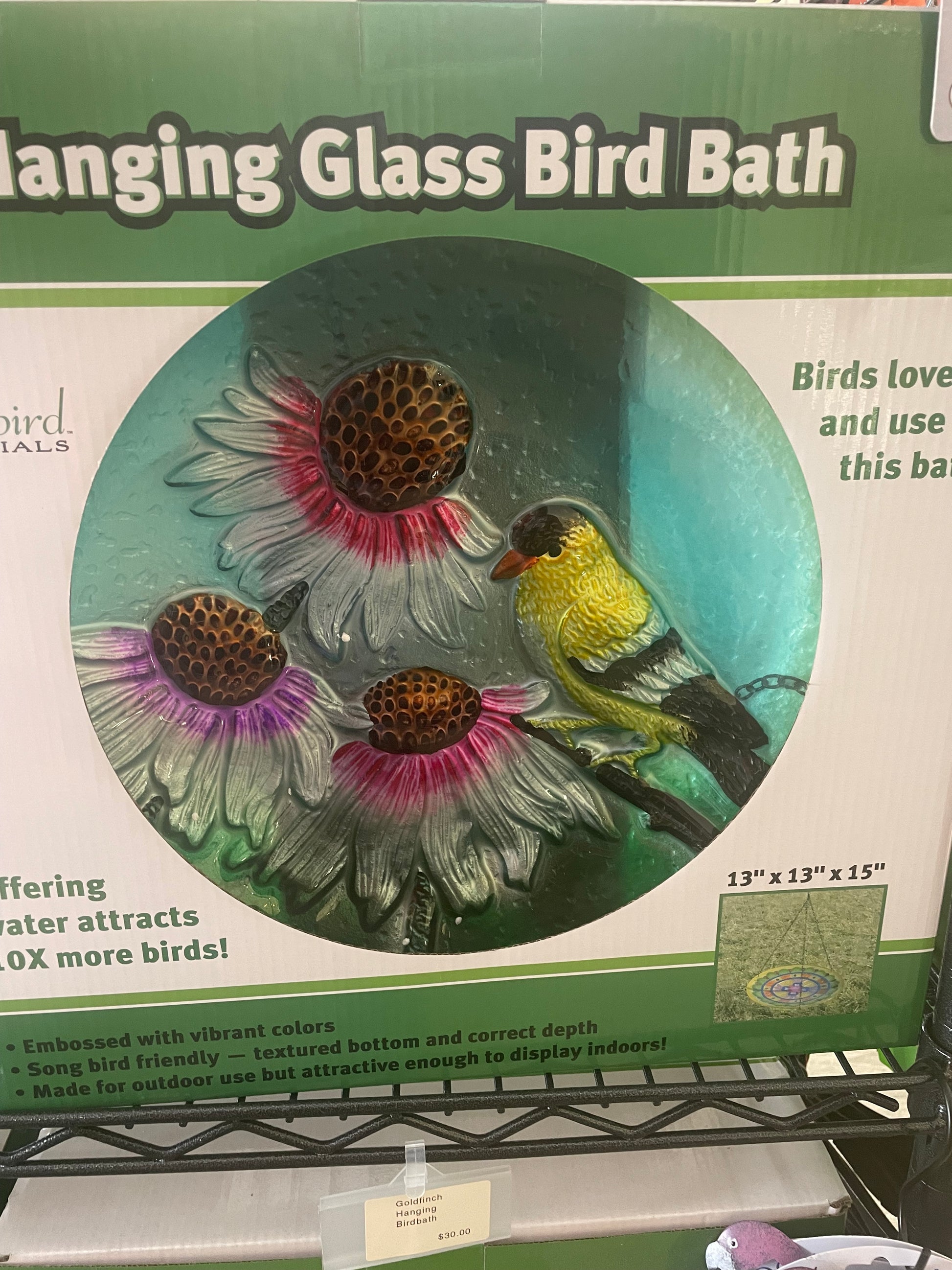 Beautiful glass hanging birdbath. Includes chain and hook for hanging.