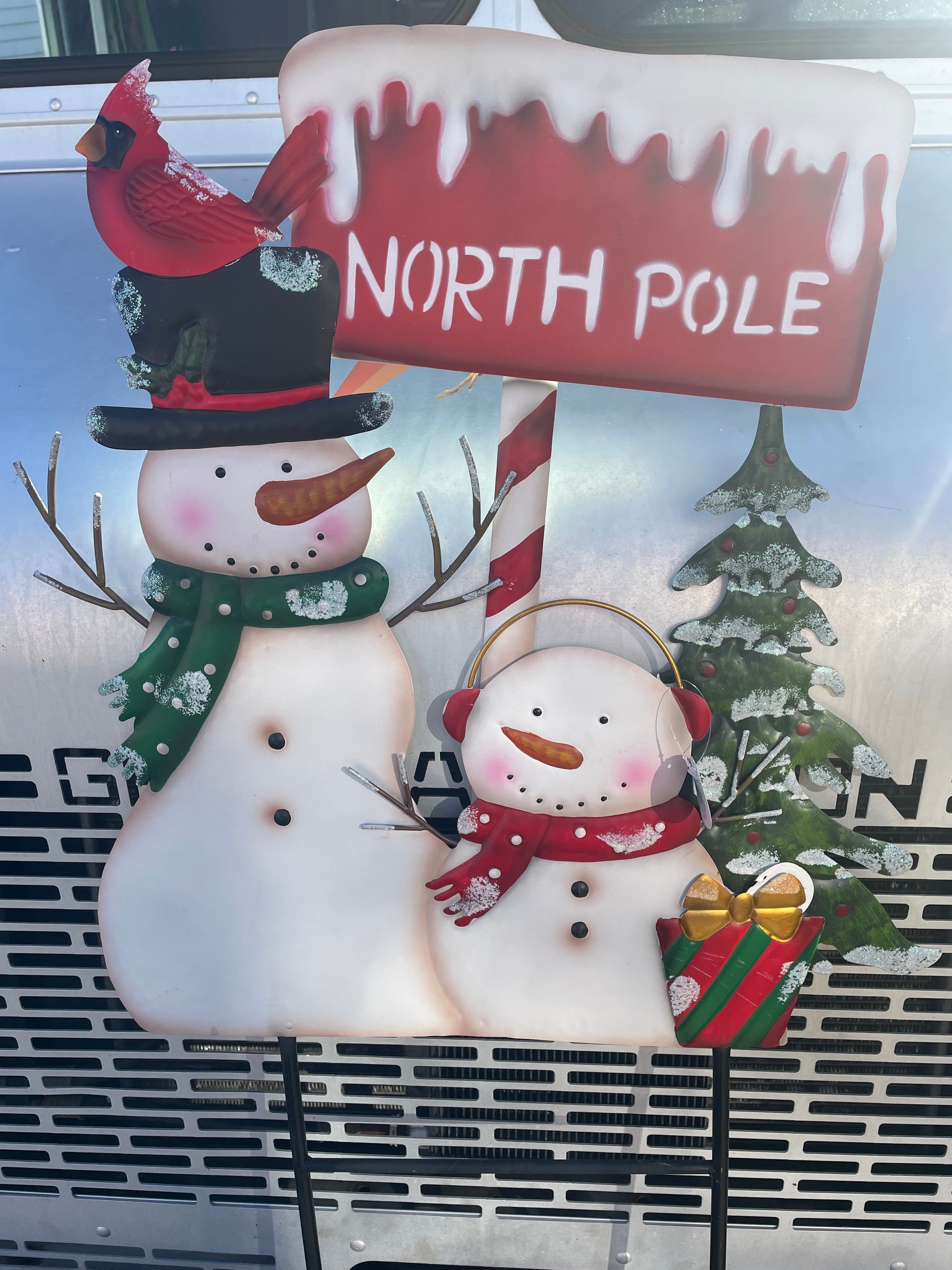 Metal Yard Sign featuring smowmen showing the way to the North Pole!