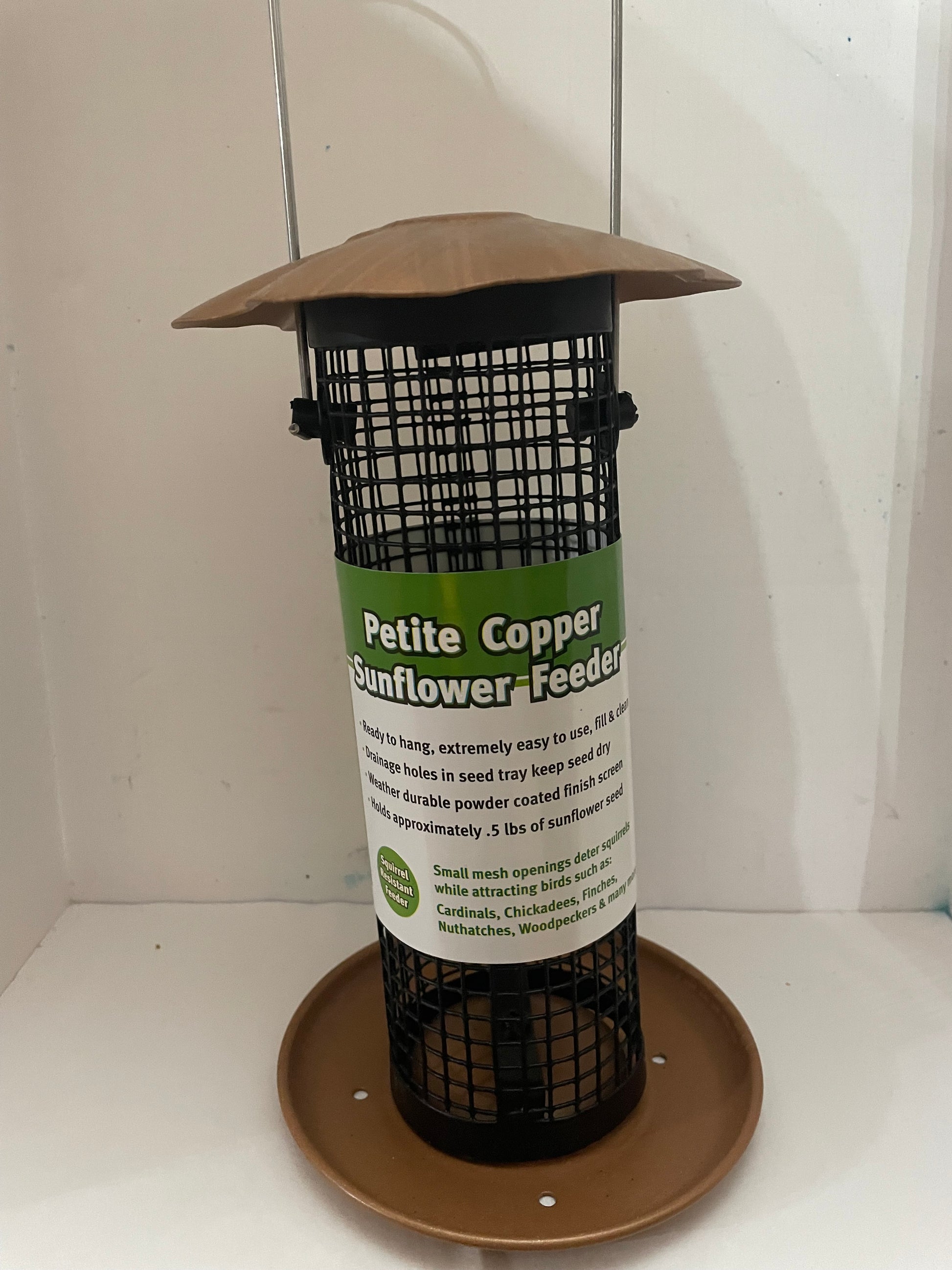 Petite Copper Sunflower Seed feeder. Constructed of a metal cage with copper colored top and base.