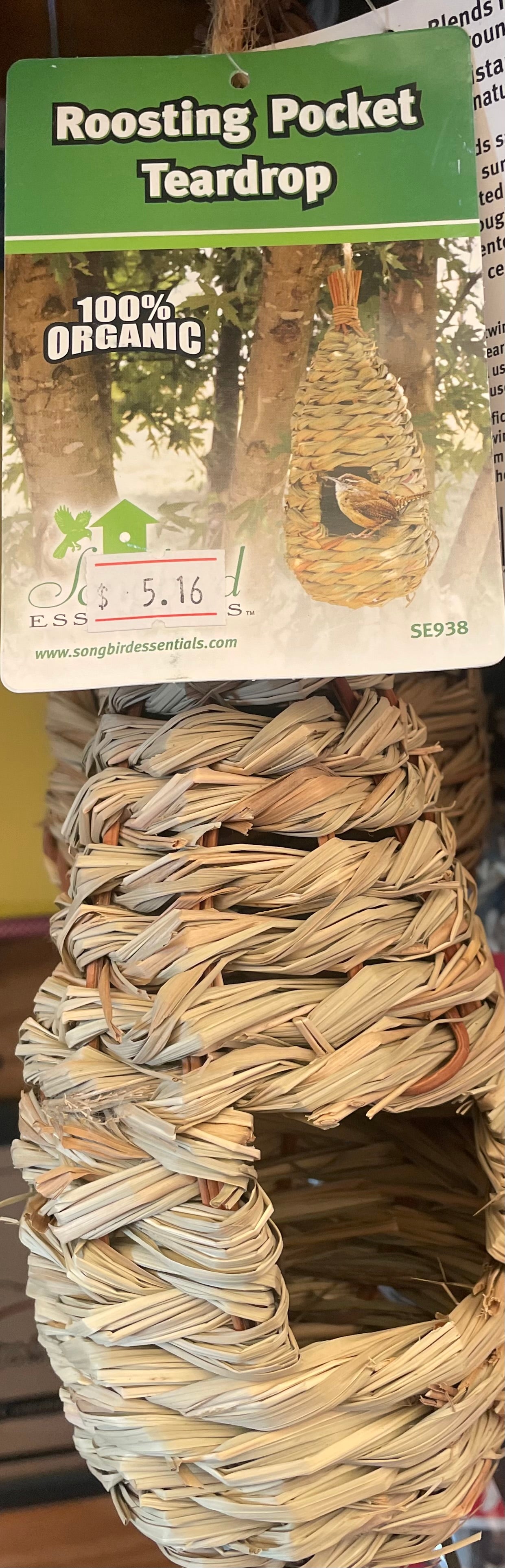 Woven teardrop shaped roosting pocket is a great place for your feathered friends to escape from the elements and predators as well.