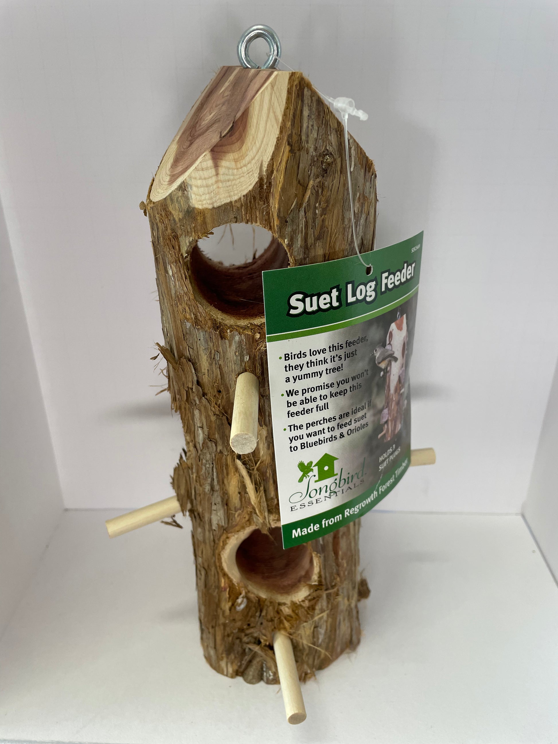 Feeder is made from natural wood and has holes drilled for the log plug suets, this is a 3 hole log with perches.