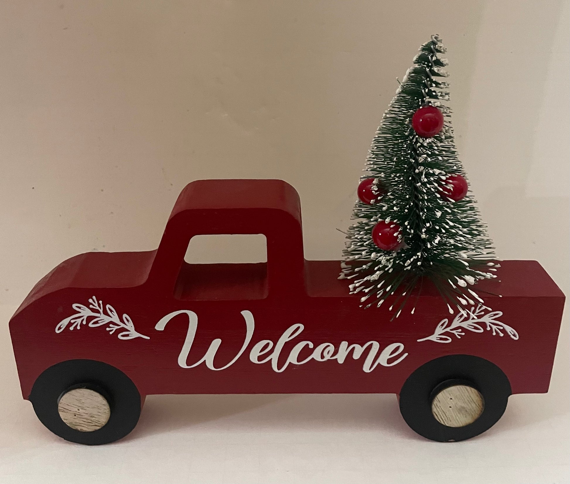 Wooden "Welcome" truck is bringing in the holiday season with a beautiful tree and a message of warmth for guests.