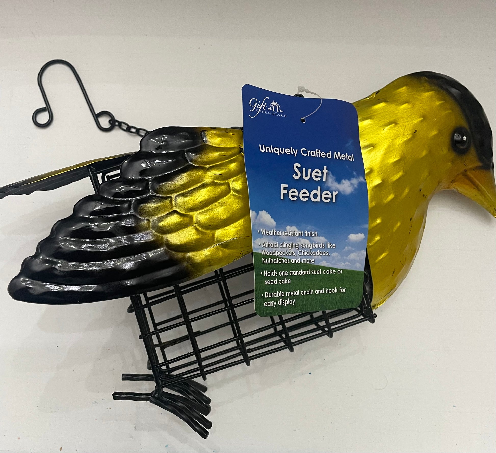 This beautiful finch feeder is made of durable metal and designed to look like your favorite yellow finch! Holds most standard size suet cakes.